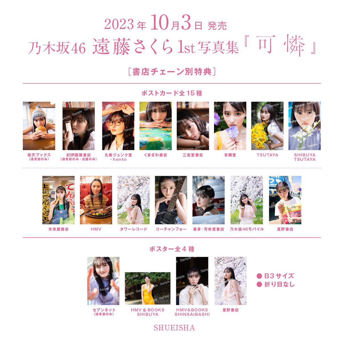 📢 #遠藤さくら1st写真集可憐 書店チェーン別ポストカード&ポスターの絵柄を公開! 各書店で"通常版"を購入すると特典としてプレゼント🎁 詳しくは各書店のSNSやHPをご覧ください!