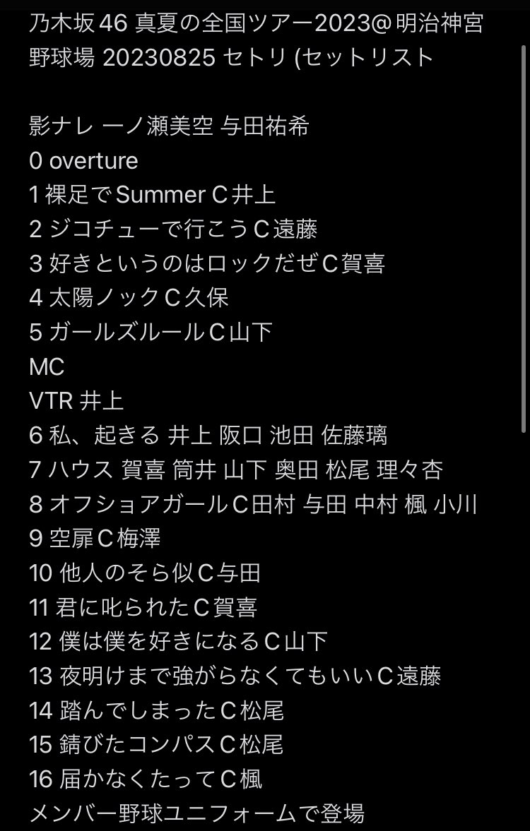 乃木坂46 真夏の全国ツアー2023@明治神宮野球場 20230825 セトリ(セットリスト