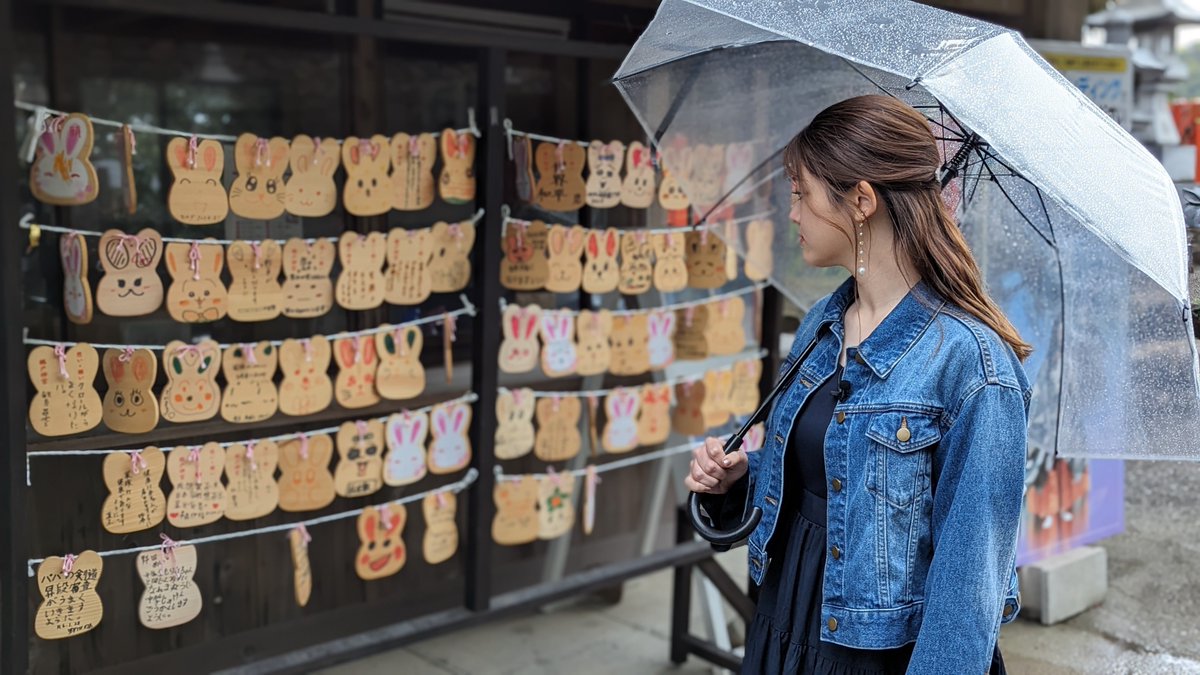 かわいいうさぎの絵馬を見つめているのは