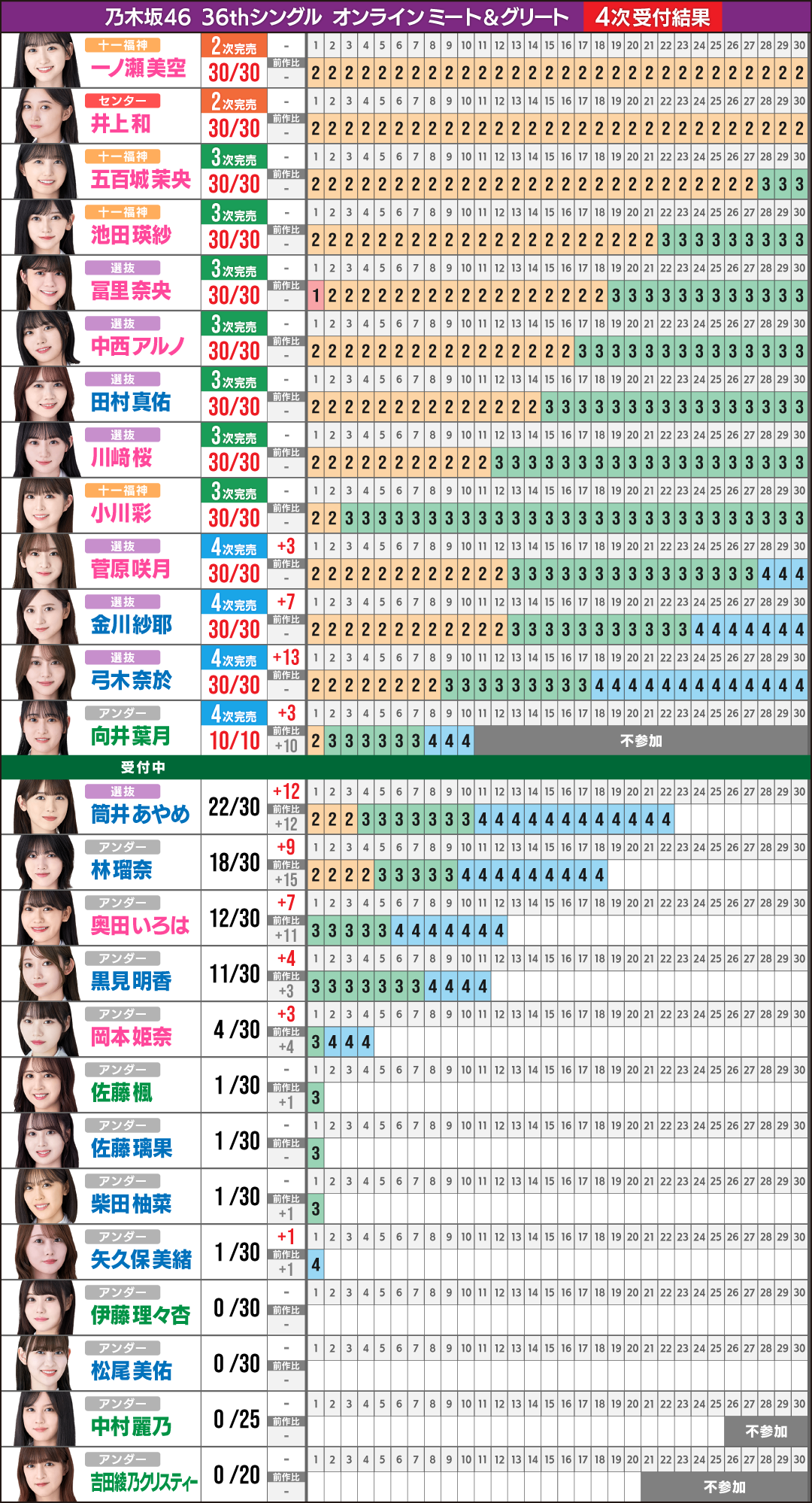 与田(30th、2次完売)、梅澤(30th、2次完売)、久保(31st、2次完売)、岩本(30th、6次完売)、賀喜(35th、2次完売)、遠藤(35th、2次完売)