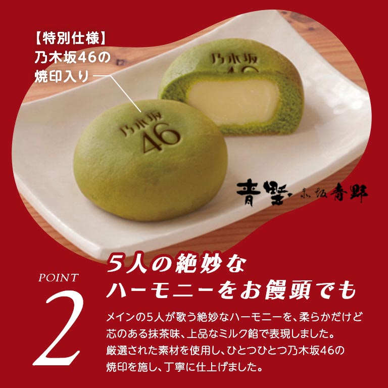 抹茶を纏った薄皮と、濃厚なミルク餡とのバランスが絶妙な「乃木坂46」焼印付きのお饅頭はなんと、デビュー当時にメンバーが訪れたことのある、老舗和菓子屋「赤坂青野」製!