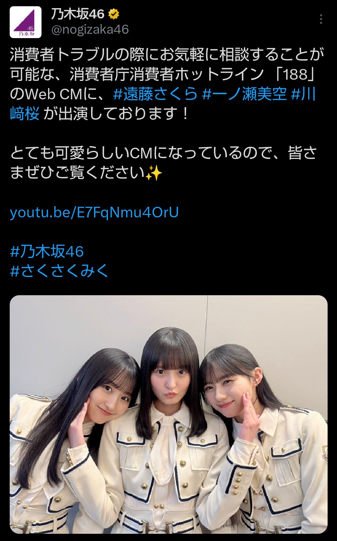 【ニュース更新】 遠藤さくら、一ノ瀬美空、川﨑桜が消費者庁のWeb CMに出演! https://t.co/y7jOHrpSqg pic.twitter.com/CqwrNzfet8